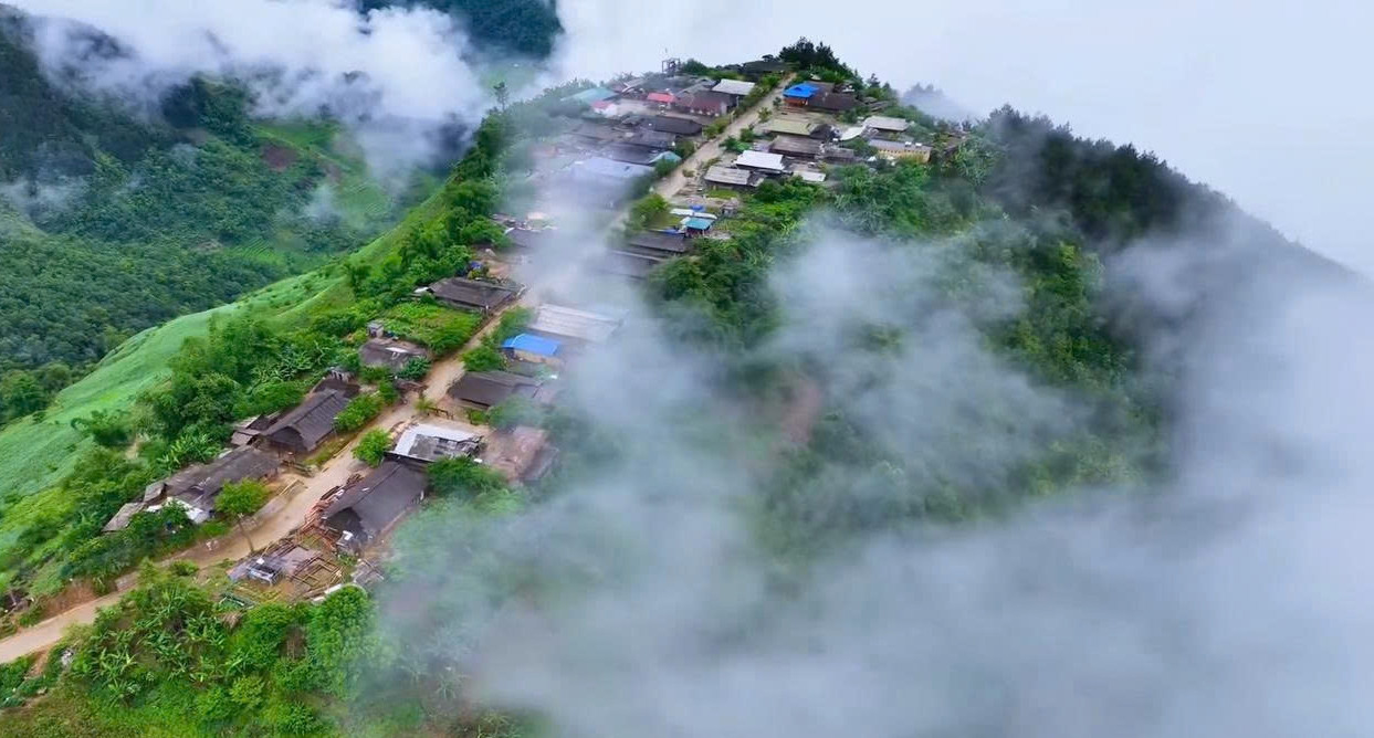 Viewed from above, the village sits atop a flat mountaintop with a straight road dividing rows of traditional wooden stilt houses. The scenery resembles a rugged mountain airstrip, drawing comparisons to Lukla Airport – known as the world's most dangerous airport.