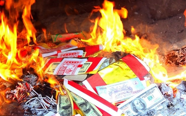 Burning votive objects has been a common act in Vietnamese cultural and spiritual practices, particularly during festivals and those of worshiping at temples or pagodas. But in recent years, the Vietnamese Buddhist Association has recommended the Buddhist believers not burn votive objects in their private homes or in public areas.