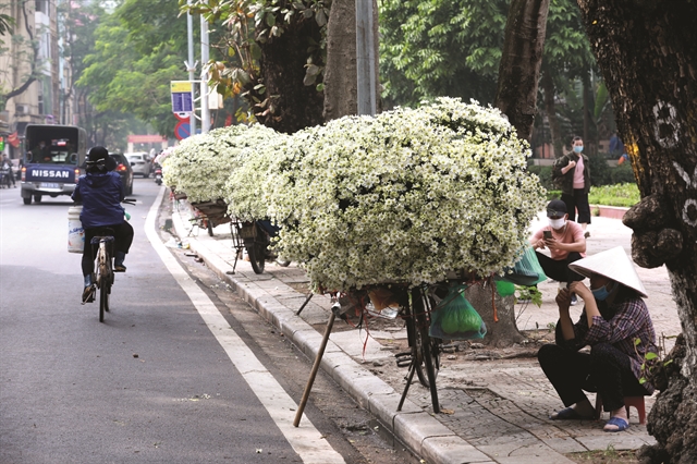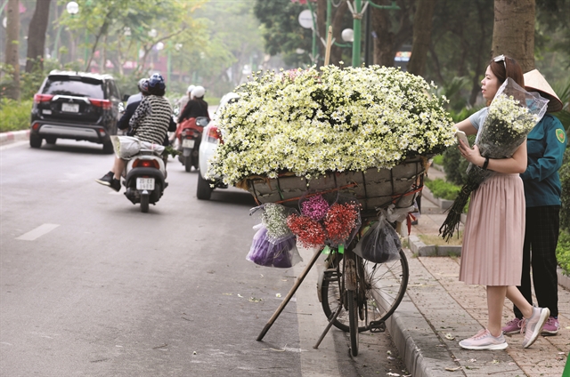 Pedestrians buying daisies on Thanh Nien Street. |