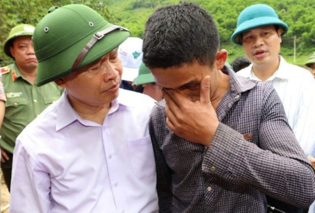 Secretary of Thanh Hoa Province Party Committee, Trinh Van Chien (left) visits Ha Van Van in Quan Son District who lost six family members in a flood which swept away his house on August 3.