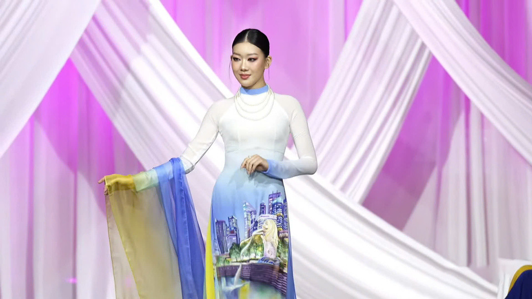 In the serene setting of the factory, 58 contestants showcased hand-painted Ao Dai that depicted iconic imagery from their respective homelands. The collection blended modern materials with traditional silk, creating a harmonious fusion that highlighted the diversity and elegance of the designs. Intricate tailoring and expert craftsmanship made the Ao Dai appear both luxurious and impressive.