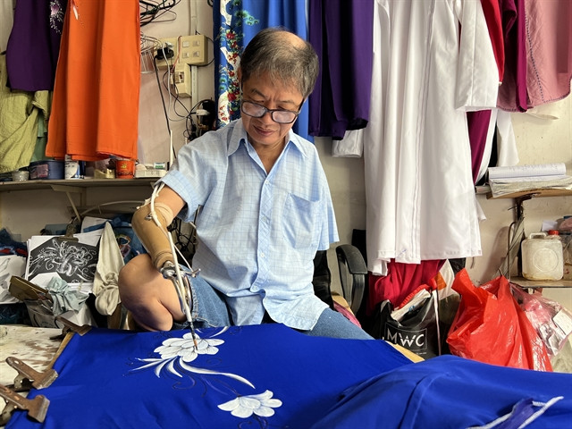 It is hard to believe that the creator of thousands of paintings on shirts and áo dài (traditional dress) is a man who had to have one leg and both hands amputated.