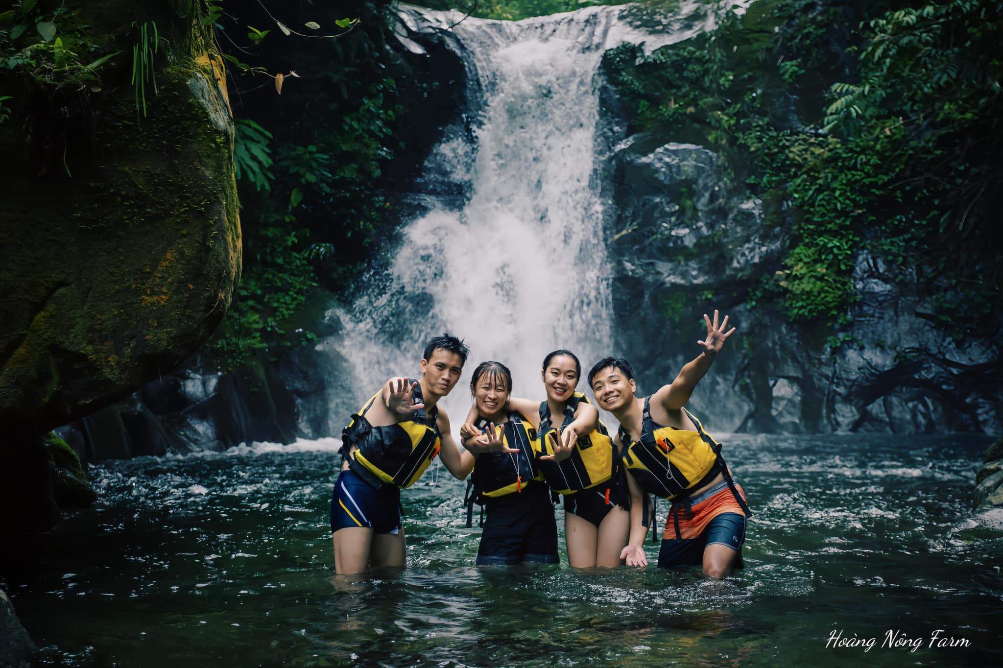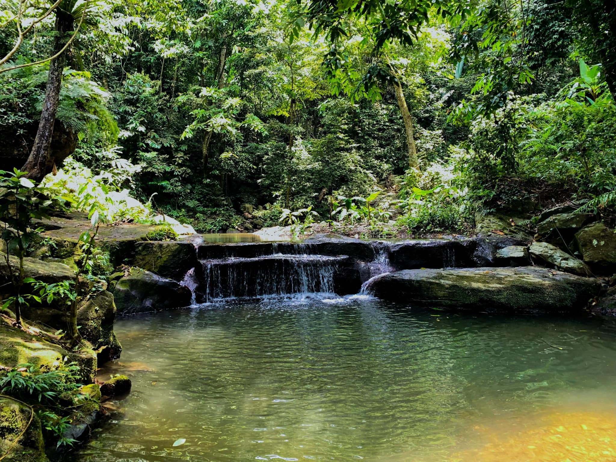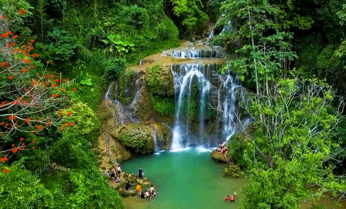 Cua Tu stream consists of seven waterfalls, flowing through cliffs and steep mountain slopes, shielded by large ancient trees. To explore the stream, visitors must trek through moss-covered rocks and swim in cool, clear blue lakes.