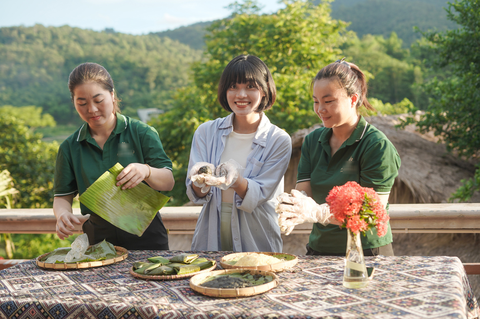 Yen also took time to savor the unique cuisine of the Thai ethnic people. She was particularly impressed by the local specialties, including a platter with purple sticky rice, grilled chicken, salads, and boiled vegetables served with chẩm chéo (a traditional Thai dipping sauce).