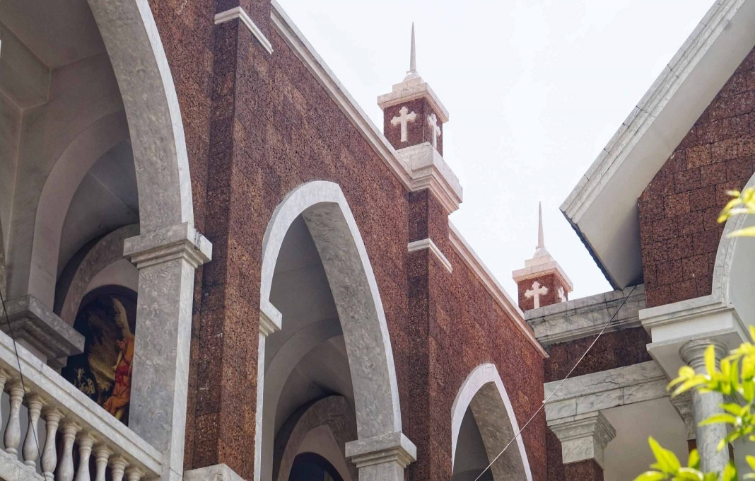 Its architecture beautifully blends Eastern traditions with Western modernity, featuring an earthy brown façade highlighted by a prominent clock and a central statue of the Virgin Mary. The church’s roof, adorned with red tiles, prominently displays crucifixes atop each peak.