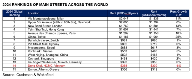 | List of the 34th edition of Global Retail Avenues, showing the world’s most expensive retail areas. Đồng Khởi in HCM City continues to be the most expensive street in Việt Nam. – Photo Courtesy of Cushman & Wakefield |