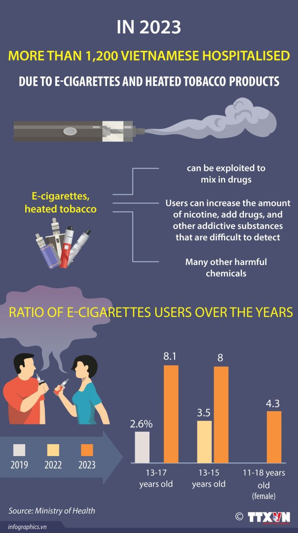 Associate Prof. Dr. Luong Ngoc Khue, former Director of the Department of Medical Services Administration under the Ministry of Health (MoH) said that in 2023 alone, 1,224 people were hospitalised due to e-cigarette and heated tobacco use, including 71 cases of people under-18 years old. Particularly, 58 were under 16 years old.