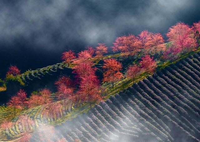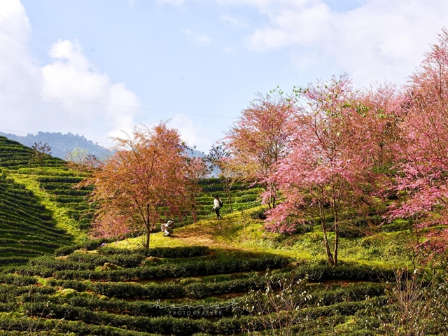 But the most beautiful trees are found at O Long Tea Hill, in O Quy Ho Ward, some 10km from central Sa Pa, beside National Highway No 4D toward Lai Châu Province, which is the most attractive destination for tourists these days. Lines of mai anh dào trees are planted along small paths on the tea hills. The flowers highlight the natural landscape, which changes according to where the light comes from throughout the day.
