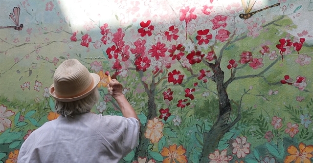 The white-haired artist's mural paintings are familiar to residents of bustling Ngõ Quỳnh in Hai Bà Trưng District of Hà Nội, beautifying the walls of many homes and the local lanes in general.