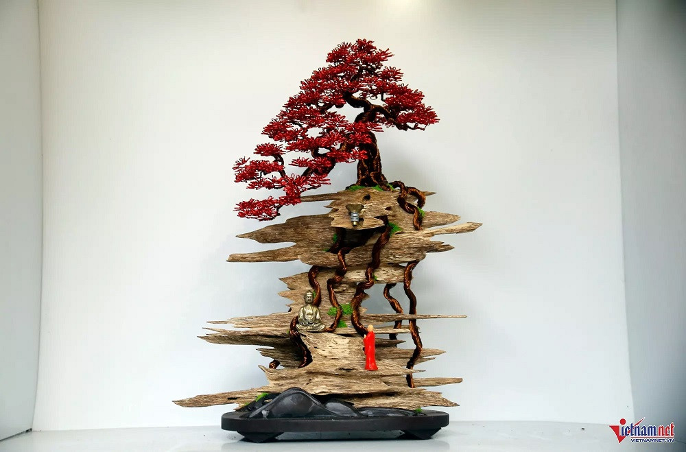He considered creating miniatures of real trees, but then he turned to handmade additions. Finally, he chose copper and aluminum wires to mold into old trees attached to agarwood roots.