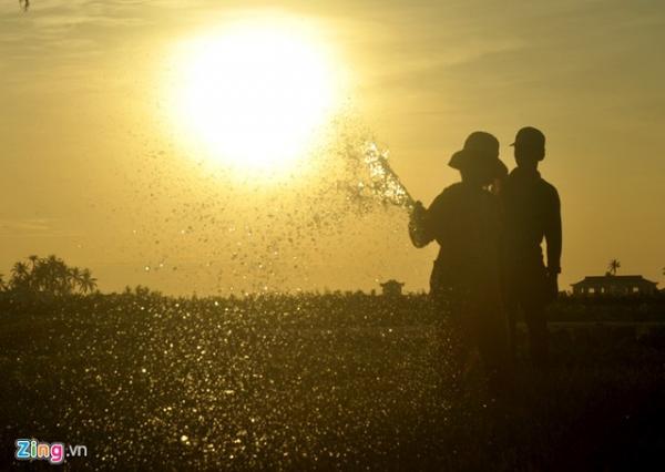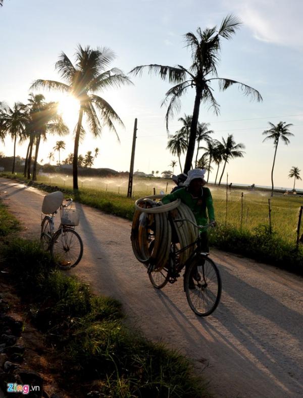 On hot summer days, from early morning, farmers of Ly Son island carry plastic pipes to the field to water their onion trees.