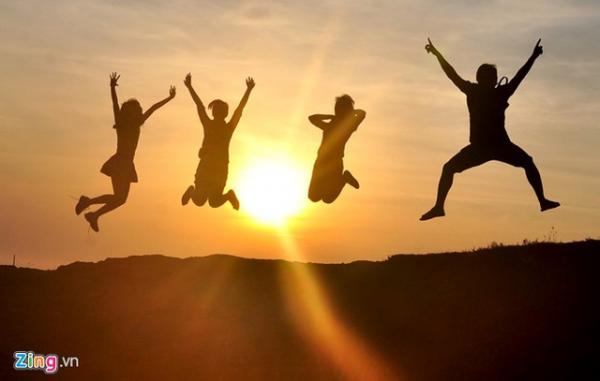 A group of young people welcome sunrise on Thoi Loi mountain.