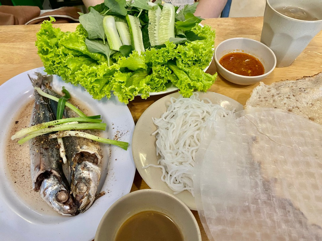 Diners can enjoy the steamed mackerel scad (nuc fish) wrapped in rice paper all year round. Nuc fish are cheap, easy to find, and usually chosen due to their high nutrition levels. According to locals, cooks should choose thumbnail-sized nuc fish to maintain the fresh and sweet taste of the dish.