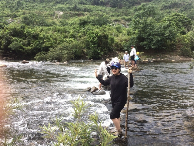 Tourists cross Vũng Bọt upstream in Tà Lang Village -- home to the Cơ Tu ethnic minority in the suburbs of Đà Nẵng City. The village has been doing the community-based tourism. — Photo courtesy of Hoà Bắc community-based tourism