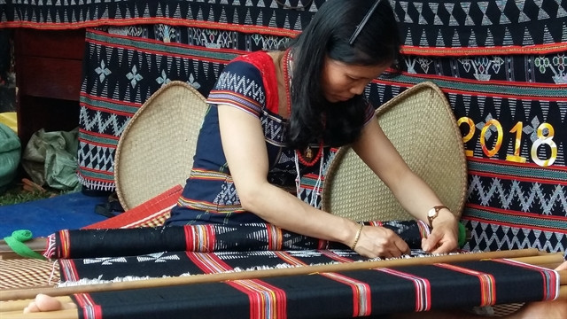 An ethnic Cơ Tu woman does brocade weaving in Giàn Bí Village of Hòa Bắc Commune in suburban Đà Nẵng. The craft serves community-based tourism in the village. —VNS Photo Lê Lâm
