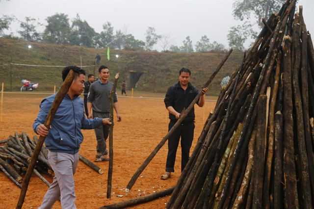 | People accumulate wood to prepare a bonfire which is the main subject of the fire jumping ritual of Pà Thẻn ethnic people. — VNA/VNS Photo Nam Sương |
