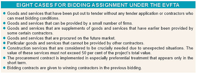 Under the agreement (EVFTA), whose negotiations were officially concluded last December and expected to be ratified by late 2016, Vietnam will allow EU companies to bid for its public contracts with ministries, including for infrastructure such as roads and ports; with Electricity of Vietnam (EVN) and Vietnam Railway Corporation; with 34 public hospitals; and with Hanoi and Ho Chi Minh City.