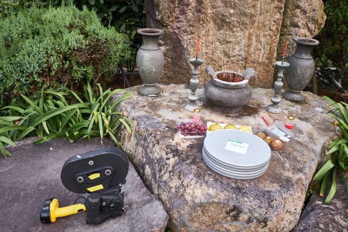 The project takes as its starting point an unfinished film shot by Raúl Ruiz in Taiwan in 1995 inspired by Taoist philosophy. The project was filmed at Chin Pao San cemetery with a Taiwanese cast and crew but never finished. Shot on 35mm film Double Guosts is staged as a series of actions seeking to reactivate this lost film following traces across the Pacific from Ruiz’s birthplace in Puerto Montt to the mountain cemetery in Taiwan.