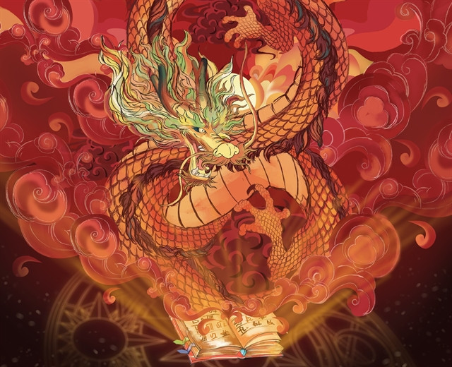 Another piece, Tái Sinh (Rebirth) by artist Mỹ Hoa, depicts the story of a young girl's special fondness for dragons and her belief that dragons still exist in the present world. She unintentionally awakens a dragon that has been sealed within a book for thousands of years.