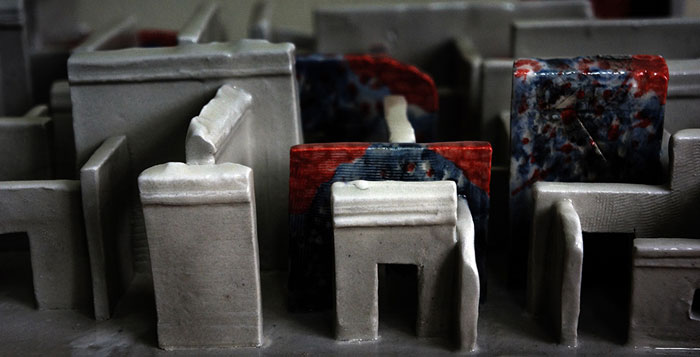 Bui Cong Khanh, White maze, 2016 – 2017, Ceramic, pedestal, projector, video camcorder, spot light.