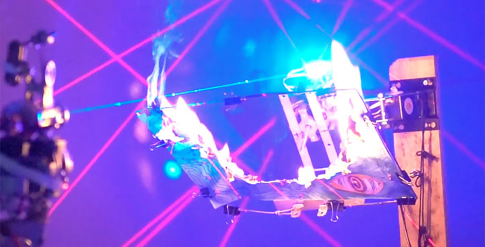 Uu Dam Tran Nguyen, License 2 Draw – Laser Target Shooting 6, 2014 – 2017, Robot, app, electronics, arduino, webcam camera, ip cameras, canvas, color pens, Mac laptop, installation, lasers, paper, fan. |