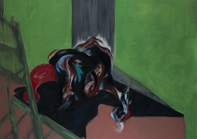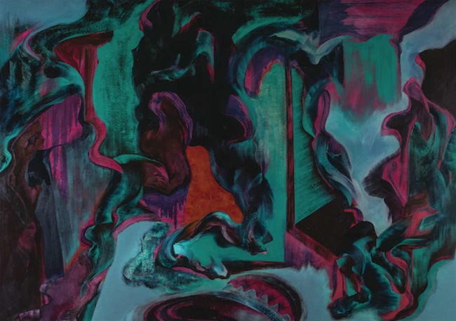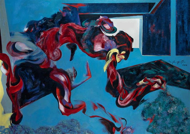 Nguyen said the central theme behind his debut collection, titled “Con Nguoi” (Manimal), is the isolation of an unreal man, who has become estranged from the society around him. Boxes and other geometric forms in the paintings represent the process of urbanization and concreteness. “Within these forms there is an inner soul that finds itself lost and shrunken in a tiny room when surrounded by a big and bustling city,” he explained. Nguyen, working in HCMC, originally planned to hold his first solo exhibition in late 2019 before the Covid-19 pandemic broke out. The suspension gave the artist more time to create an array of works that avoid similarity or repetition. The 12 paintings in the Manimal collection on display have been curated by the artist himself from a larger group of works that he has created over the past year. Nguyen’s color palette is rich in many of the works and then dark and black in other pieces. “Vivid colors such as reds, purples, blues and yellows are symbols of modernity, while black and white represent the past or old objects for me. This collection is a study in colors and shapes, which both contrast and complement each other,” he said. A painting titled “Tron” (Slip), which was the last painting in the series completed, may be the greatest representation of Nguyen’s visual aesthetic. It shows the confidence of an artist who has already completed an entire collection of works and is free to use what he has learned along the way to create a signature piece. With his collection Manimal, Nguyen has managed to create a new visual language that is appealing and unique. He also expects to bring about an energetic new breeze to the Vietnamese visual arts. The Manimal exhibition will run until October 16. Below are some artworks on display.