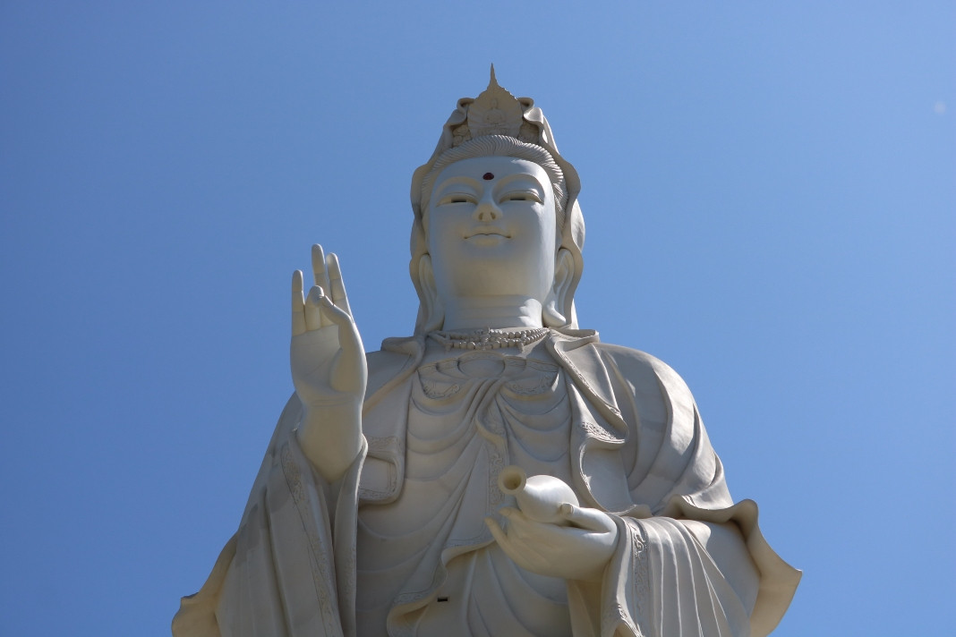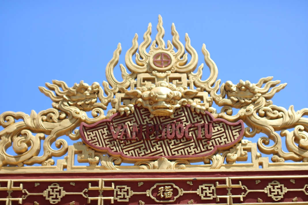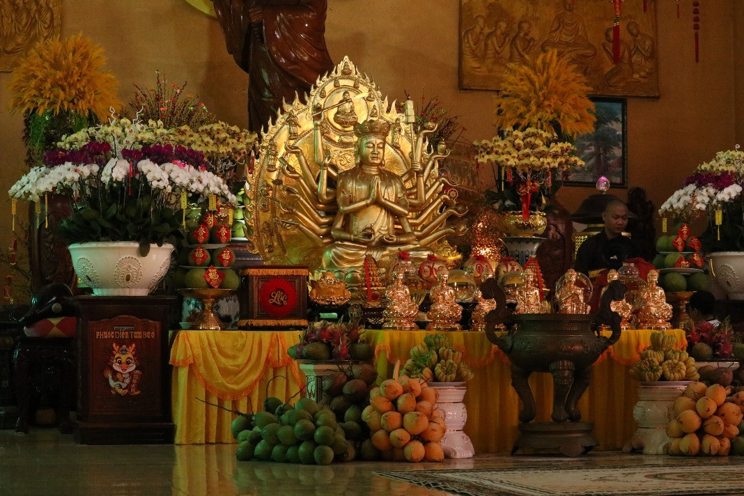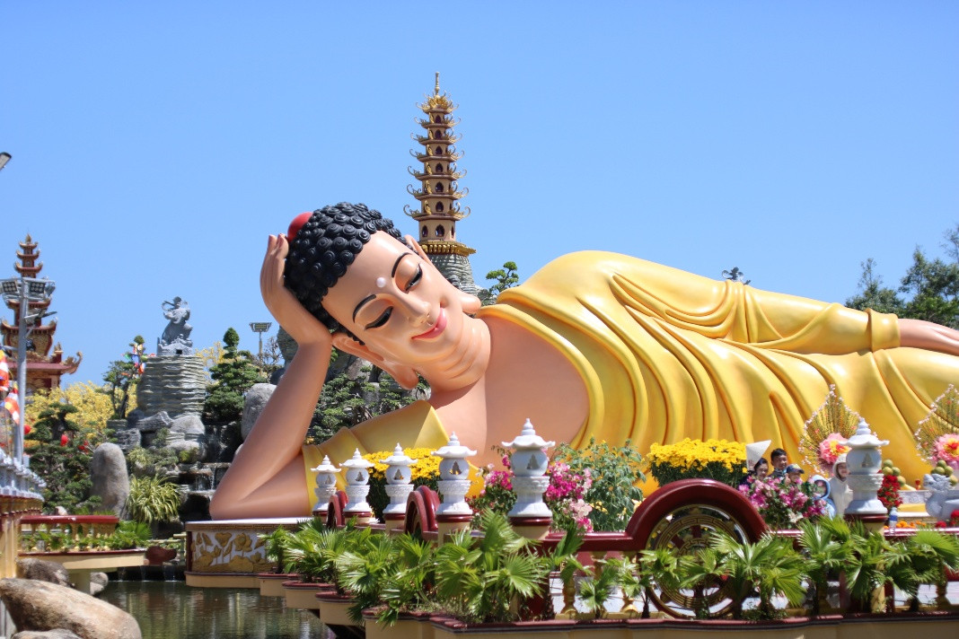 The pagoda’s dignified name boardThe pagoda features the classic Vietnamese Buddhist architectureThe pagoda features the classic Vietnamese Buddhist architectureDominating the skyline is the towering statue of Avalokitesvara Bodhisattva, standing at an impressive height of 54 metersA lying Buddha statue captivates visitorsStep inside the pagoda to discover a world of intricate woodwork and gilded accents, enveloping visitors in an ambiance of tranquility and reverenceStep inside the pagoda to discover a world of intricate woodwork and gilded accents, enveloping visitors in an ambiance of tranquility and reverenceStep inside the pagoda to discover a world of intricate woodwork and gilded accents, enveloping visitors in an ambiance of tranquility and reverenceThe bell-ringer’s face reflects the golden hues of the pagoda’s ornate interiorDevotees receive blessings and lucky money from Buddhist monksTraditional Vietnamese conical hats, known as nón lá, are adorned with well wishesStepping through the pagoda’s back door, visitors are greeted by the serene vista of a tranquil riverLotus and blue lotus ponds surrounding the pagoda add to its enchanting allure