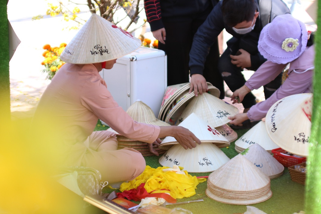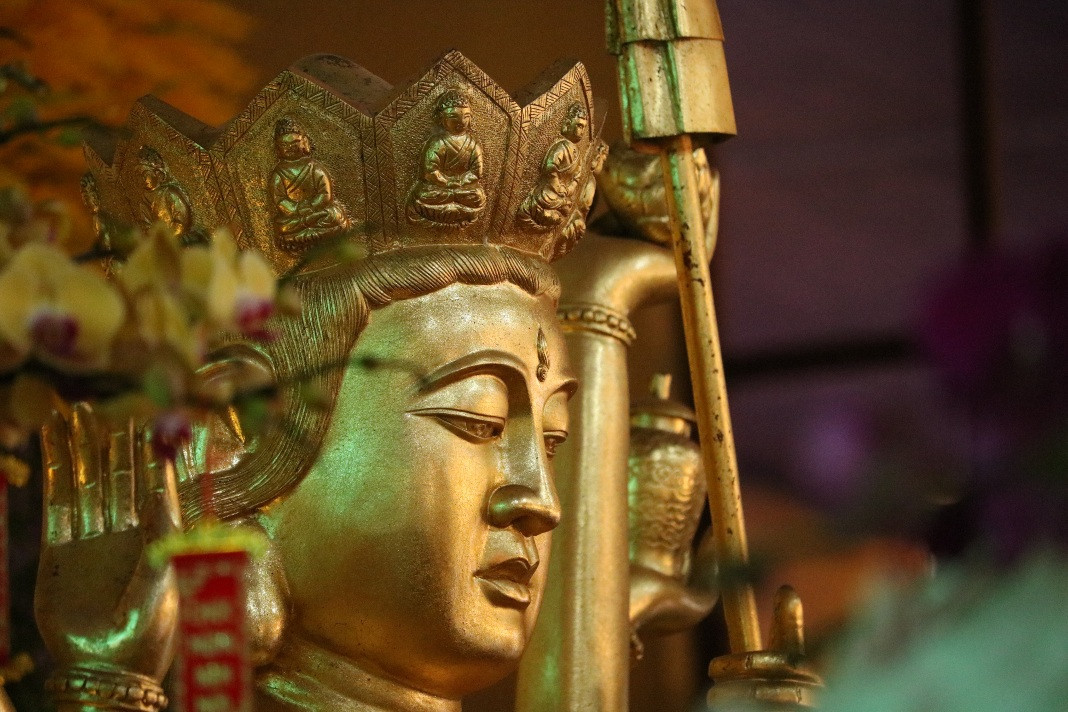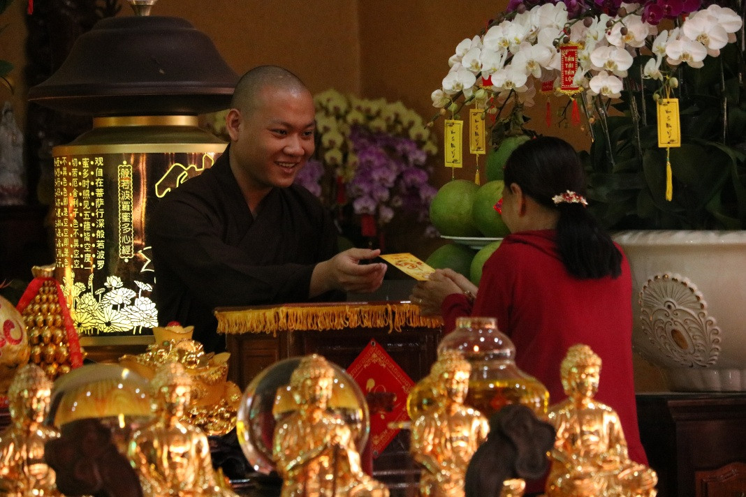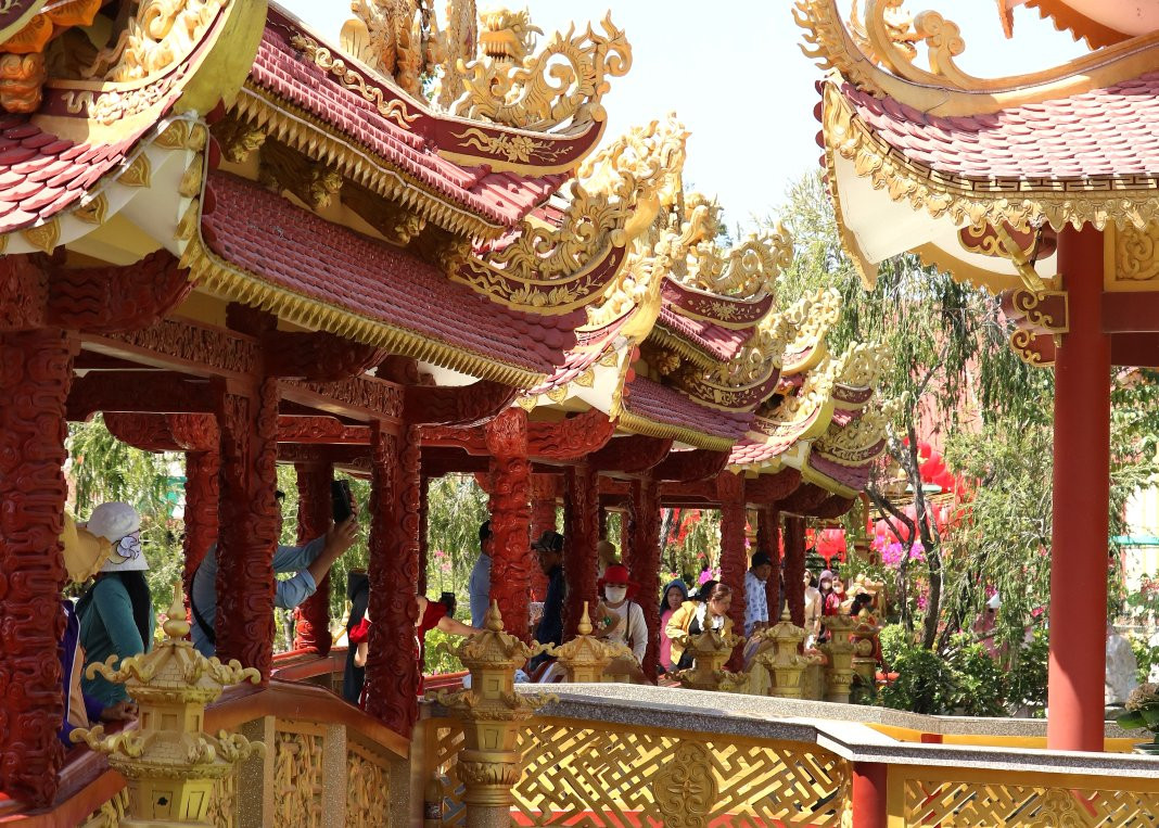 The pagoda’s dignified name boardThe pagoda features the classic Vietnamese Buddhist architectureThe pagoda features the classic Vietnamese Buddhist architectureDominating the skyline is the towering statue of Avalokitesvara Bodhisattva, standing at an impressive height of 54 metersA lying Buddha statue captivates visitorsStep inside the pagoda to discover a world of intricate woodwork and gilded accents, enveloping visitors in an ambiance of tranquility and reverenceStep inside the pagoda to discover a world of intricate woodwork and gilded accents, enveloping visitors in an ambiance of tranquility and reverenceStep inside the pagoda to discover a world of intricate woodwork and gilded accents, enveloping visitors in an ambiance of tranquility and reverenceThe bell-ringer’s face reflects the golden hues of the pagoda’s ornate interiorDevotees receive blessings and lucky money from Buddhist monksTraditional Vietnamese conical hats, known as nón lá, are adorned with well wishesStepping through the pagoda’s back door, visitors are greeted by the serene vista of a tranquil riverLotus and blue lotus ponds surrounding the pagoda add to its enchanting allure
