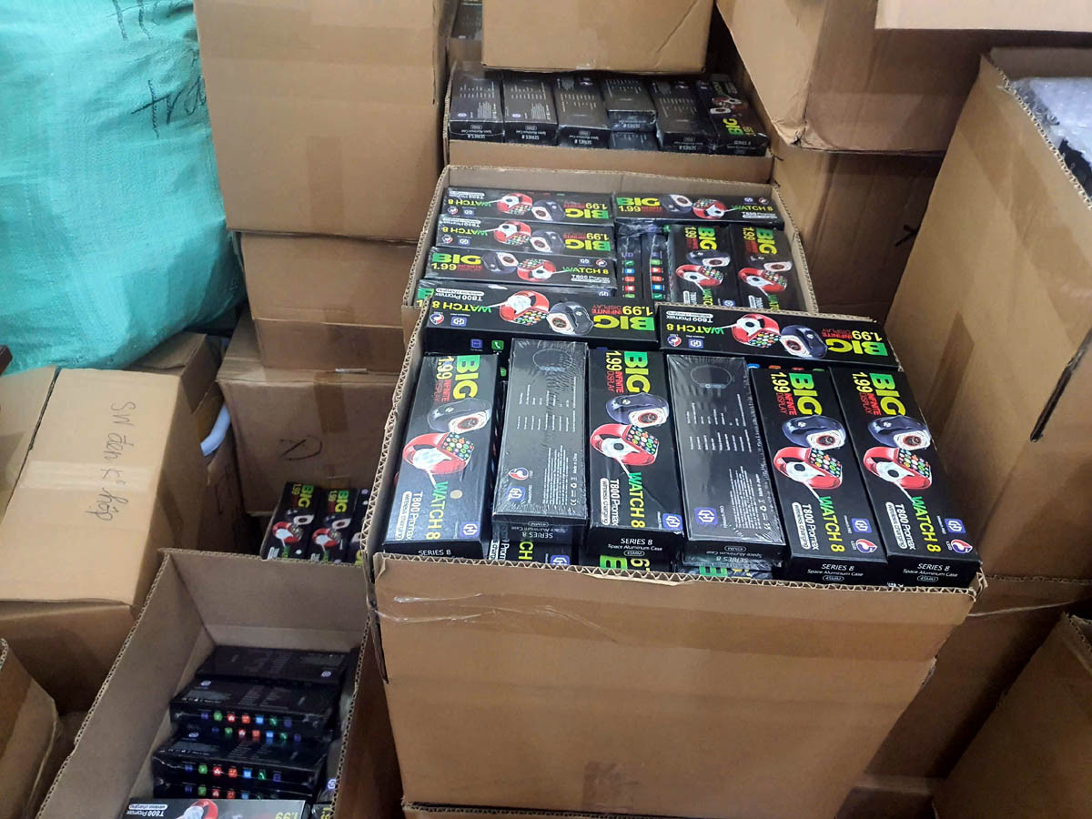 At two adjacent four-story houses in the General Department 5 residential area (Tan Trieu Commune, Thanh Tri District), authorities discovered a large counterfeit goods warehouse. Items seized included 12,200 smartwatches, 6,800 Marshall headphones, 30 Ms Kill Bur II speakers, 1,700 Emberton speakers, 850 Nillen speakers, 2,550 Fujisu vacuum cleaners, 900 Omega watches, 475 Orient watches, and thousands of clothing and accessories of unknown origin.