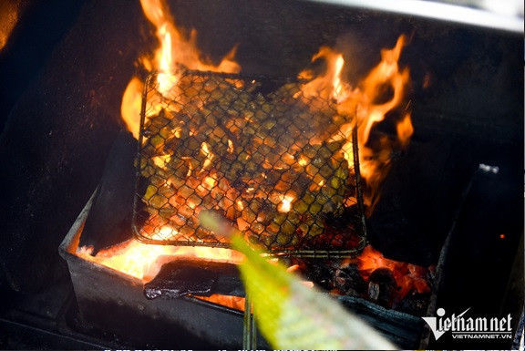 Around 7 AM, the coal stove turns red, and the two main cooks continuously grill over a hundred racks of sliced pork and patties.