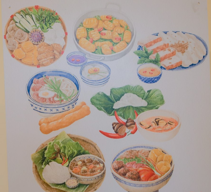 It features colorful paintings of Hanoi delicacies such as pho (noodle soup), banh cuon (steamed rolled pancakes), bun cha (vermicelli with grilled pork and fresh herbs), bun oc (rice noodle soup with freshwater snails) and bun thang (vermicelli noodles with assorted toppings).