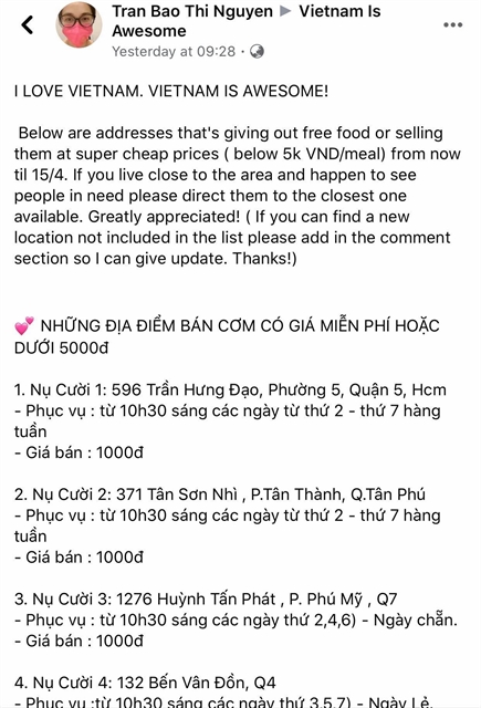 A Facebook user has gathered a list of restaurants that sell meals at a cheap price (below VNĐ5,000) or give them away for free, so readers can direct struggling locals to such restaurants.