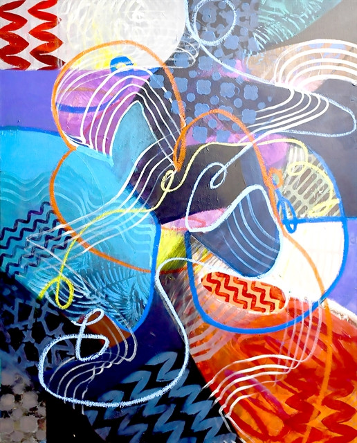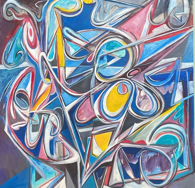 Painter Nhân showcases 24 abstract paintings. All are titled Đường Tơ (Silk Thread).