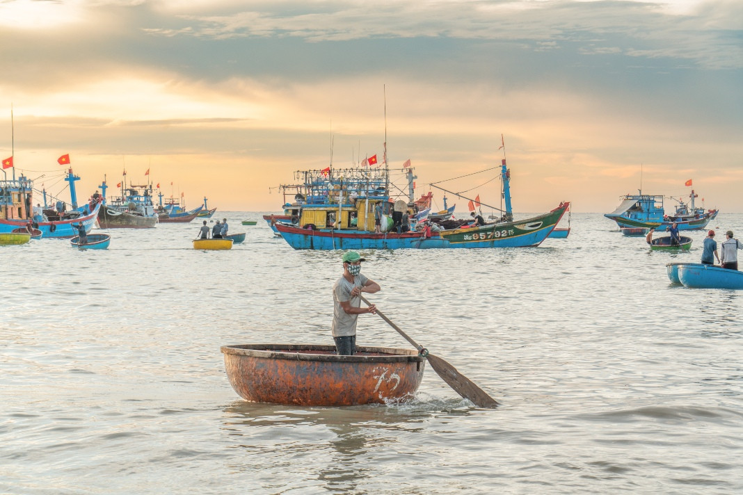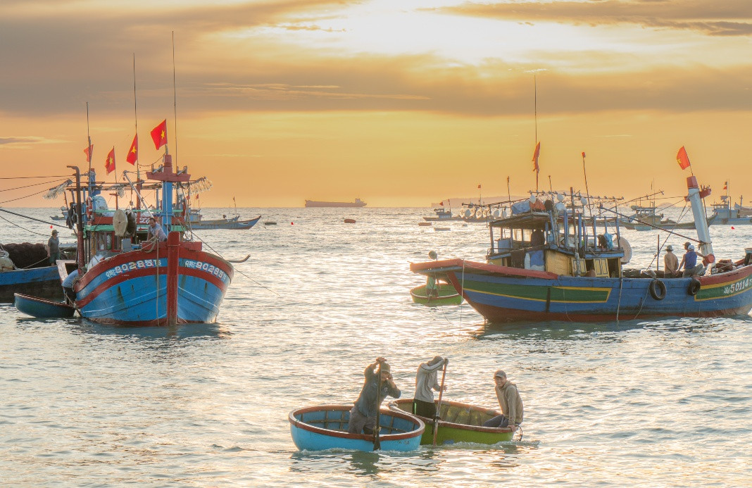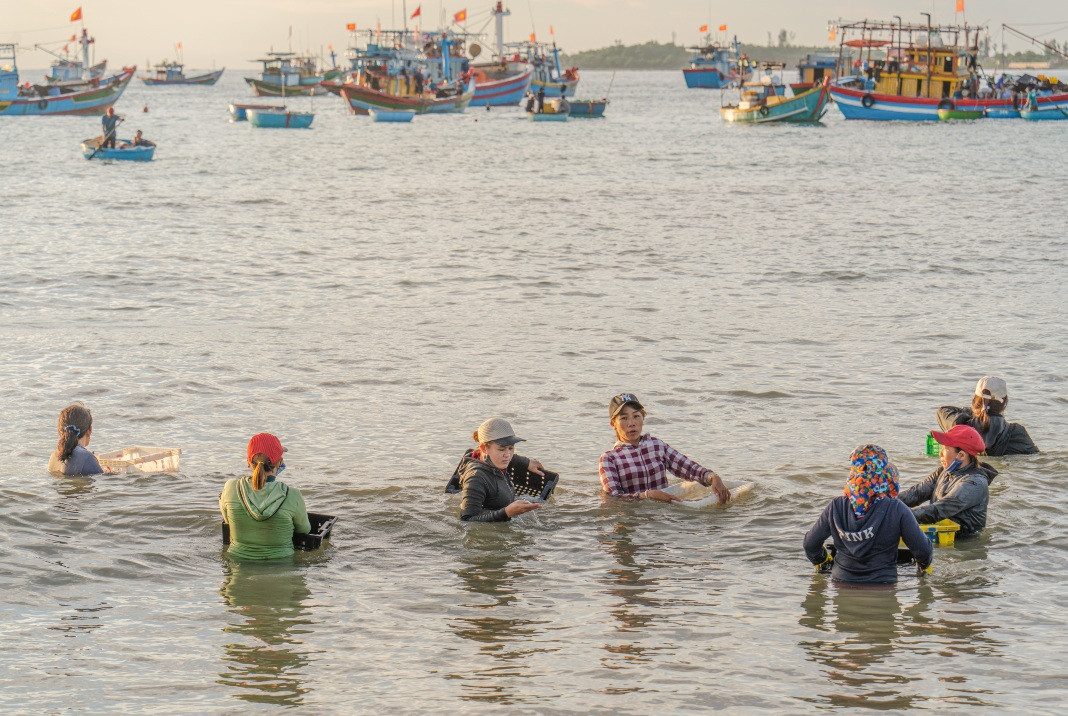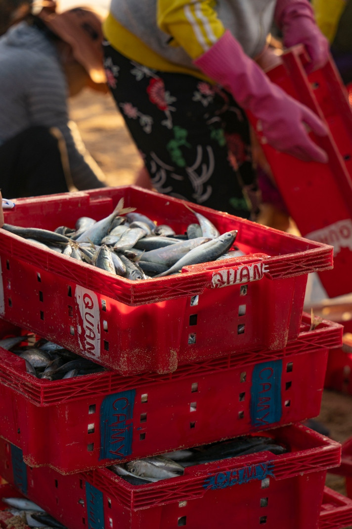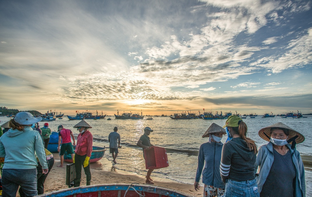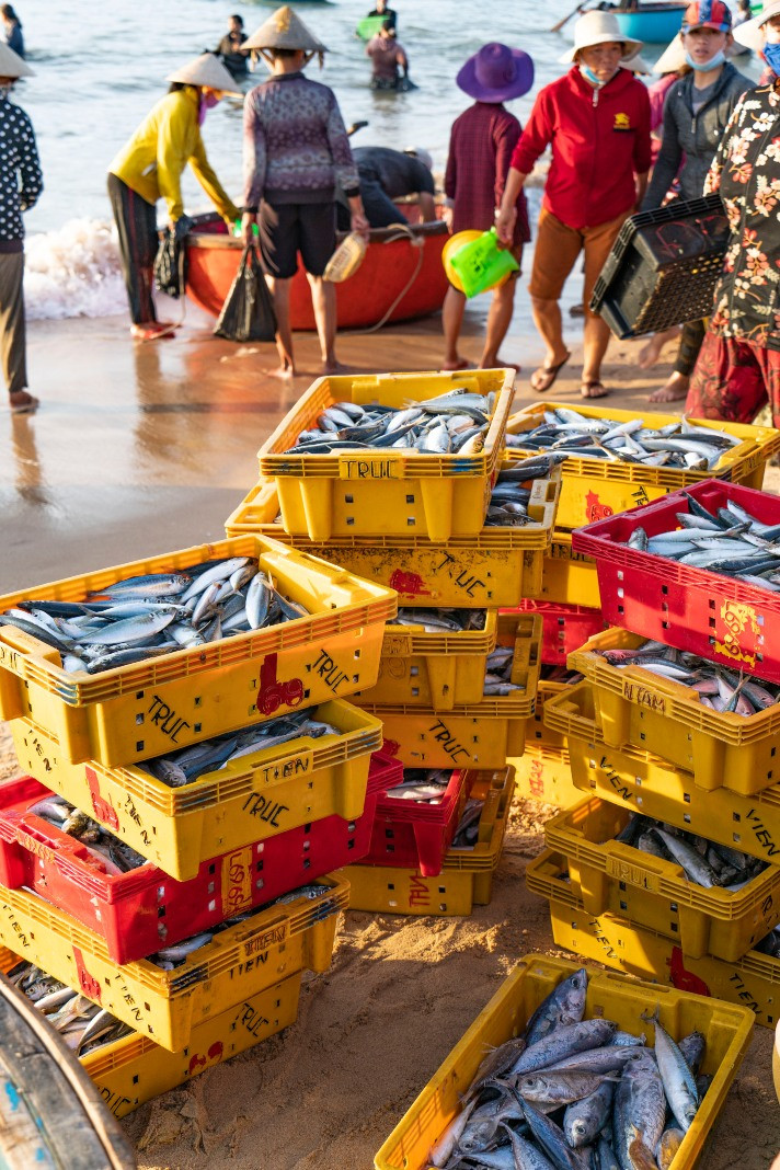 Early in the morning, the atmosphere is the liveliest when boats dock at the village with various kinds of fish and squid caught. Some transport fish by basket boats while others buy and sell fish at the seaside.