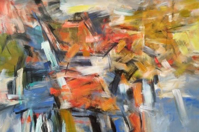 The “Chuyen Pho” (Street Stories) exhibition features nearly 40 new works created this year by Vu Bich Thuy, Tran Luu My, Doan Hoang Lam, Tao Linh and Nguyen Minh. The only woman in the group, Vu Bich Thuy, brings to the exhibition her own experience through everyday stories, with a personal perspective of a family-oriented woman. Thuy’s paintings depict small street corners, plant pots on the doorstep, or afternoon sunshine, using light-hearted color palette. Tran Luu My’s abstract paintings feature houses and trees with lots of wind and sunshine. His paintings remind viewers of a quiet middle-aged man walking along a windy street.