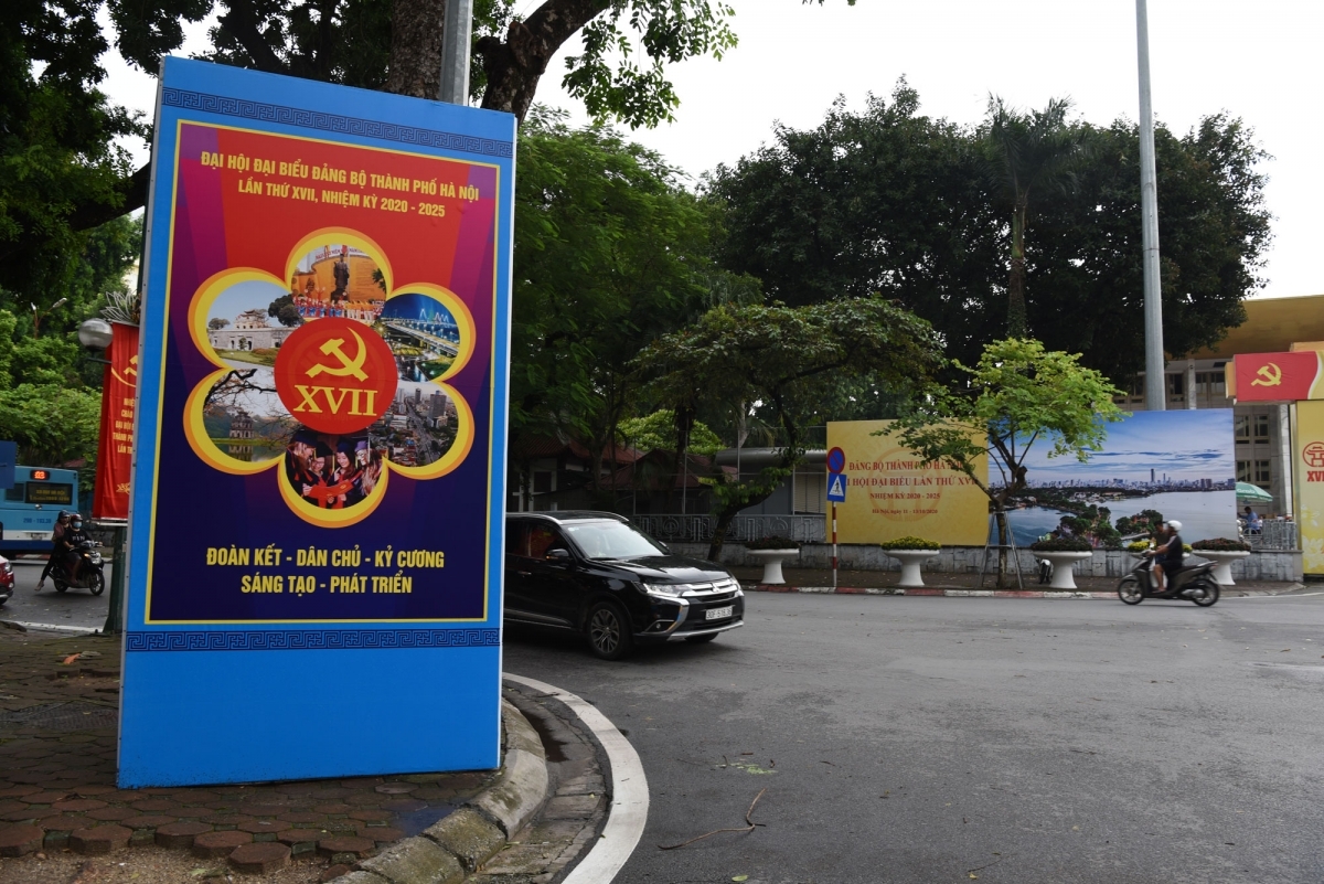 Two large posters that celebrate 1,010 years of Thang Long-Hanoi, from 1010 to 2020, and the 17th Hanoi Party Congress for the 2020-2025 term are carefully placed on Dinh Tien Hoang street.