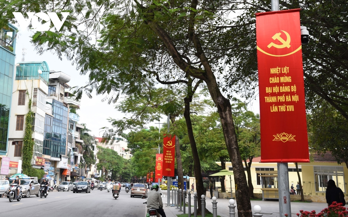 Many streets in the capital have been decorated with national flags along with colourful flowers and banners as part of celebrations to mark 1,010 years of Thang Long-Hanoi and the upcoming 17th municipal Party Congress.