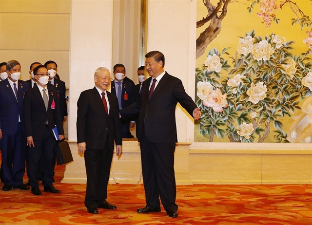 | General Secretary of the Communist Party of Việt Nam Nguyễn Phú Trọng and General Secretary of the Communist Party and President of China Xi Jinping at the welcoming ceremony for the Vietnamese Party leader in Beijing on October 31, 2022. VNA/VNS Photo Trí Dũng |