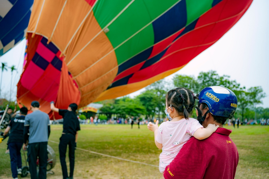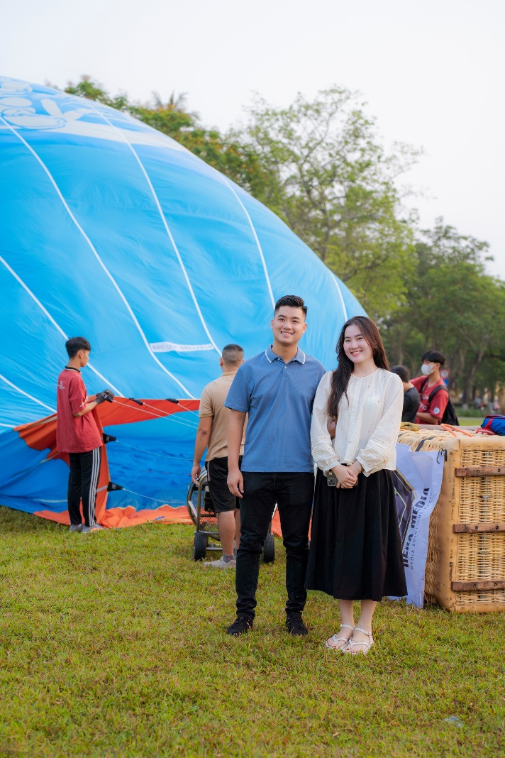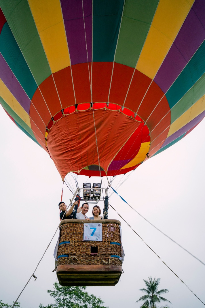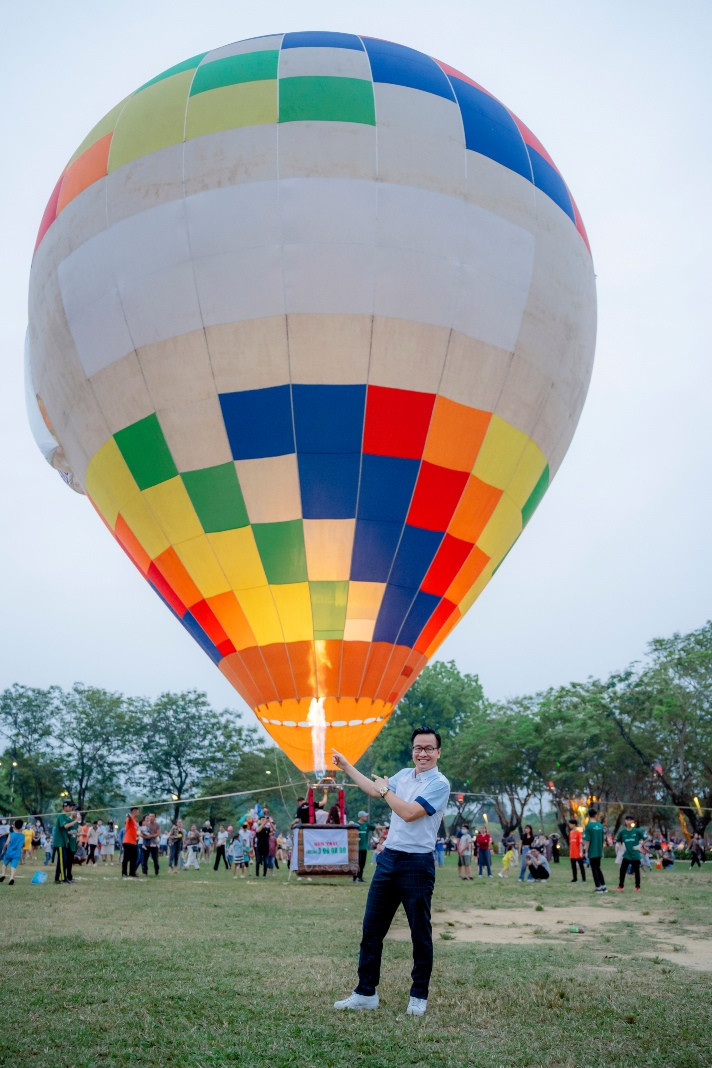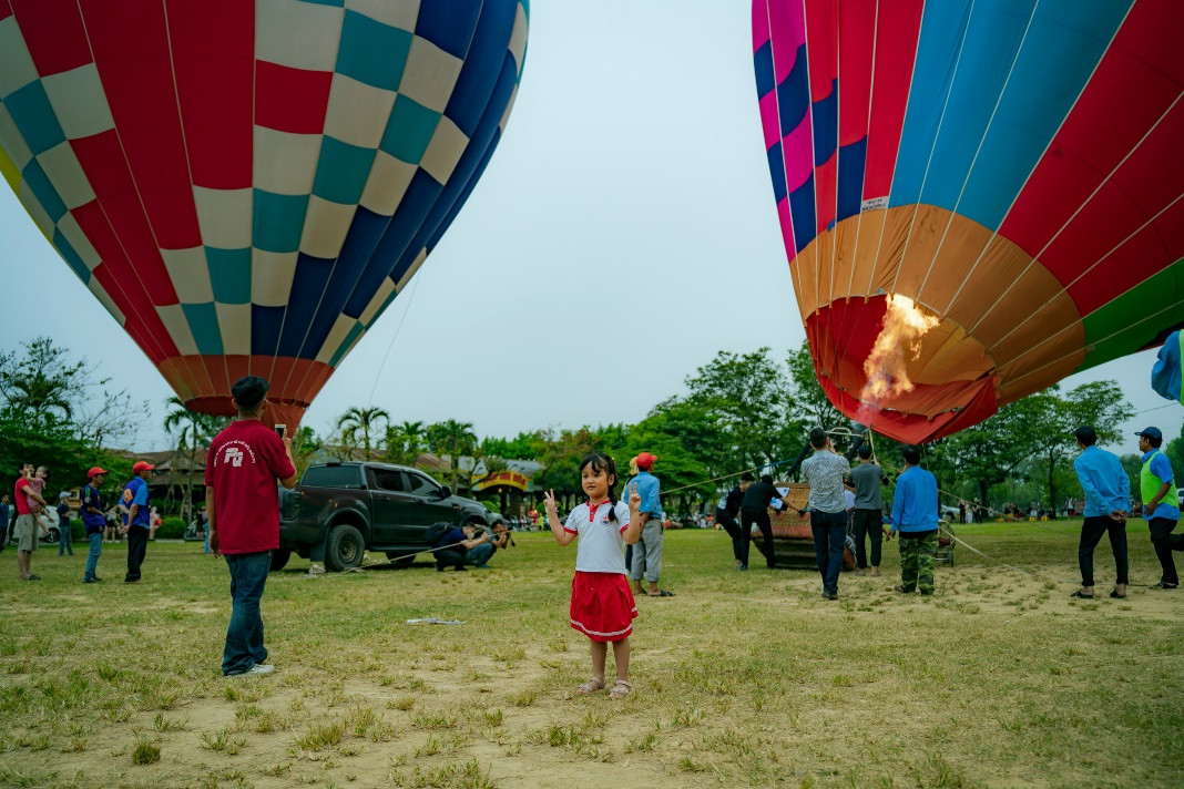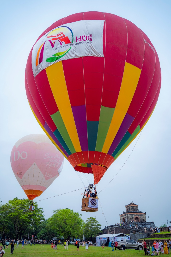 Balloons fly over the privy council. This is one of the famous scenic spots of Hue, apart from the Huong River, Ngu Mountain, Vong Canh Hill, etc., that guests can enjoy from the balloonsSports commentator Ta Bien Cuong – one of the thousands of tourists – joins the festivalA balloon is being prepared for takeoffEach balloon can carry two to three guests. They can fly for 45 minutes at an altitude of 300-500 metersGuests experience the tethered hot air balloon ride within 5 minutes at an altitude of 300-500 metersA young lady poses for a photo inside a balloonBalloons fly over Hue’s Citadel. This year’s hot-air balloon festival is a highlight, kicking off the summer tourism season of Hue as well as responding to the Week of Hue Festival 2023A guest enjoys flying in a hot-air balloonDong Ba Gate in the east of Hue’s Citadel is seen from the balloonsThe festival expects to meet the needs of domestic and foreign tourists to experience Hue’s cultural heritage from a different perspective, said Nguyen Van Phuc, director of Thua Thien Hue Department of TourismA kid poses with a balloonAnother kid and her father watch the balloonsThe festival attracts many young guests