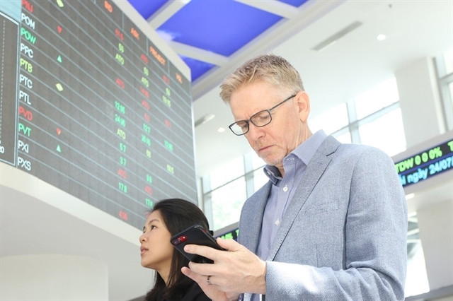 | Two investors at the HCM Stock Exchange. The total value of net sales by foreign investors on the HOSE, HNX and UPCOM exchanges exceeded VNĐ5.3 trillion in April 2024. —VNA/VNS Photo |