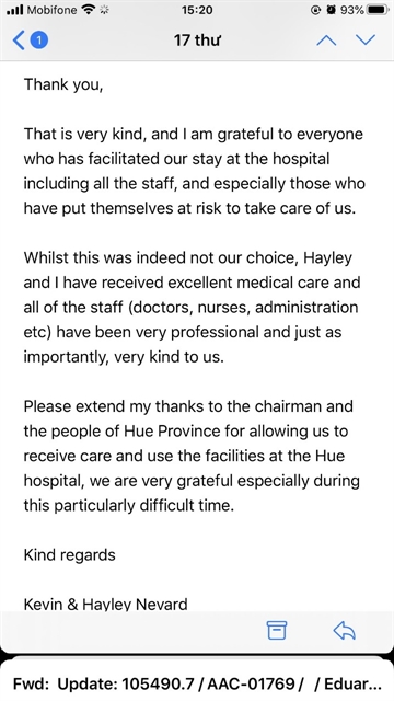 An email letter ofKevin Nevard and Hayley sent to Thừa Thiên-Huế People's Committee. Photo courtesy Thừa Thiên-Huế People's Committee