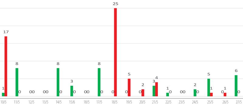 | Infections (red) and convalescents (green) in Vietnam over the last two weeks. Source: Ministry of Health |