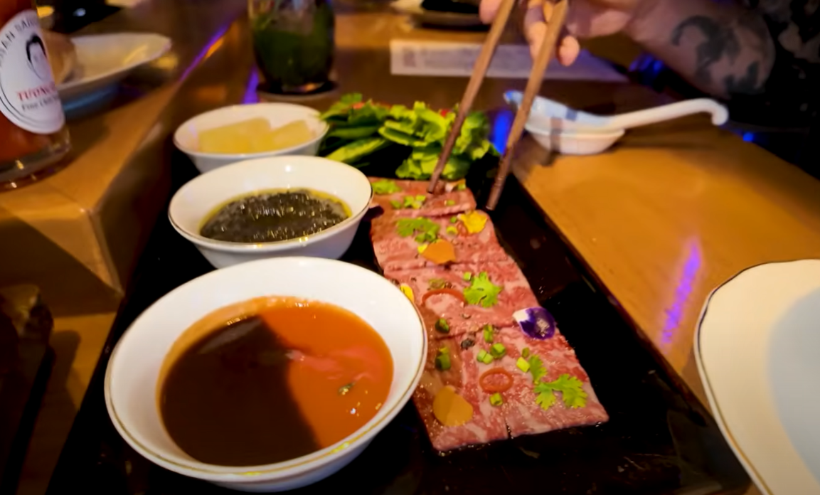 Then the main dish arrived: the noodles served separately in a porcelain bowl, while the richly scented broth, slow-simmered for two days, was presented in a stone bowl alongside various cuts of beef and a side of raw wagyu. A tray of dipping sauces and a raw egg yolk completed the lavish setup.