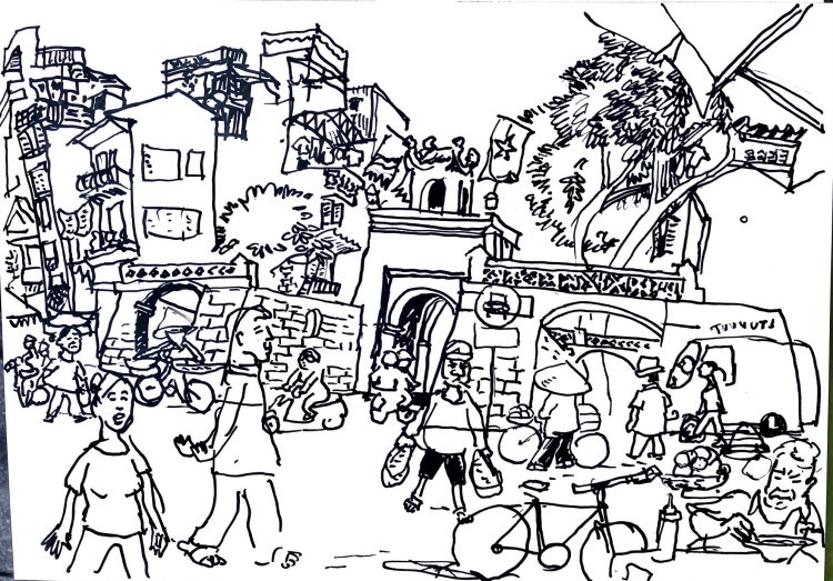 In 1987-1988, French cartoonist Jean-Charles Sarrazin roamed the streets of Hanoi and the countryside. He took about 300 photos, mainly about the life of Hanoi people, street corners, houses and rustic rural images. He also sketched many scenes in Hanoi, Vietnam and has kept them until now. These works have been displayed in several small exhibitions in Paris.