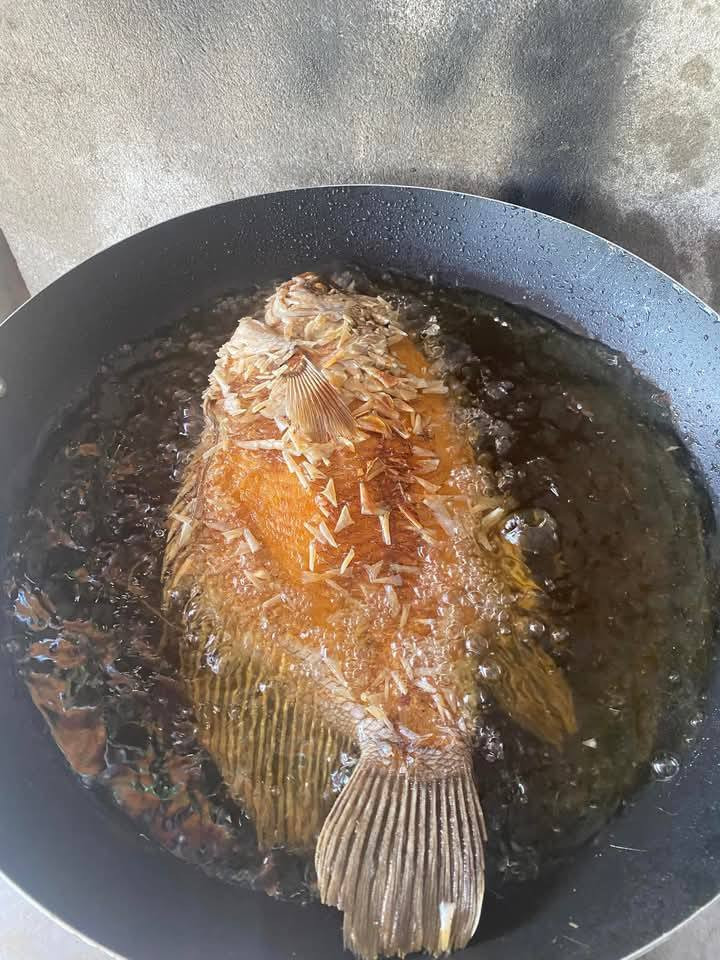 The fish is then processed, cleaned, and its scales are left intact. After washing, the fish is dried and deep-fried. "This dish is not complicated to prepare but requires the chef to have experience and skill."