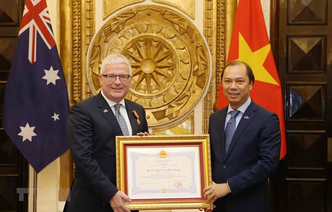 Vietnamese Deputy Minister of Foreign Affairs Nguyen Quoc Dung (right) hands over the Friendship Order toOutgoing Australian Ambassador to Vietnam Craig Chittick. |