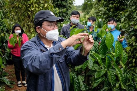 An agronomist guides farmers on signs of healthy peppercorns on a farm in Đắk Sông District, Đắk Nông Province. — Photo courtesy of IFC