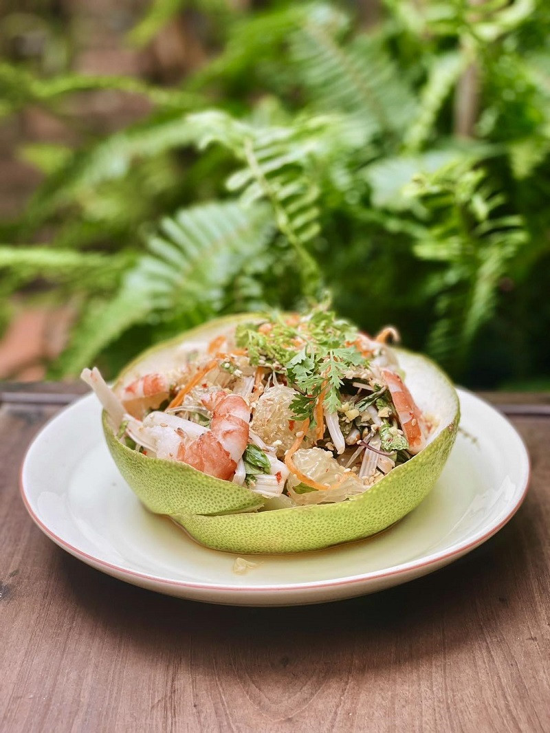 | The dish of polemo salad is prepared by chefs from Sente Restaurant in Hanoi |