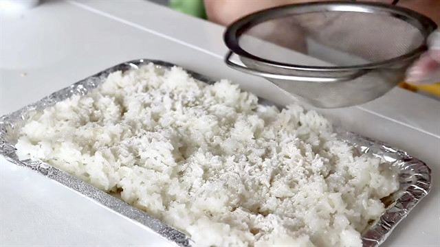 A special yeast for making cơm rượu is thoroughly sprinkled on cooked glutinous rice before a three-day fermentation. VNS Photo Gia Linh |