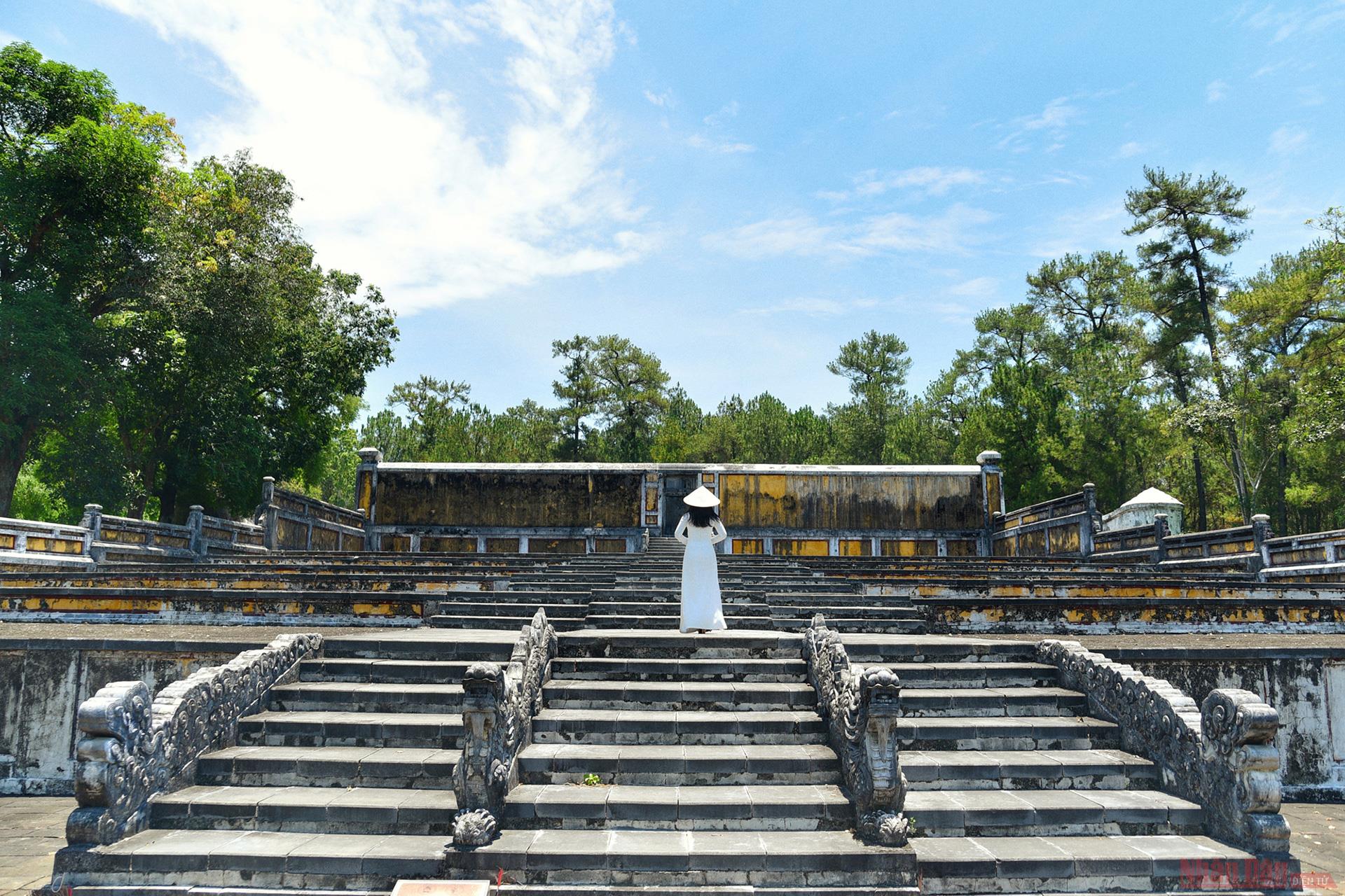 King Gia Long’s shrine is located on a flat hill, with Dai Thien Tho mountain ahead, seven others behind, and 14 others on each side.